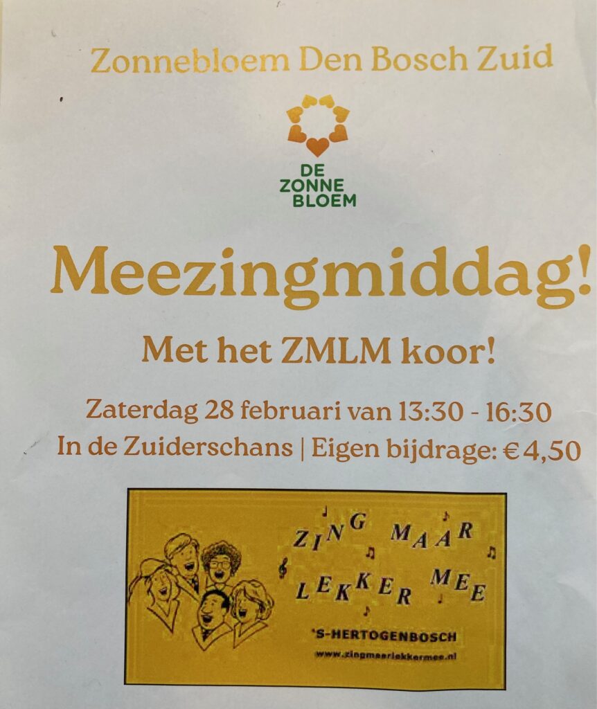 Zaterdagmiddag 28 februari waren we te gast voor een optreden in de Ziuderschans voor de Zonnebloem (Zuid) Met slechts 14 leden hebben we een geslaagd optreden kunnen verzorgen. Een zaal vol leden van de Zonnebloem en bewoners van de Zuiderschans, die veel liedjes uit het hoofd meezongen, maar ook met ondersteuning van onze goed verzorgde “Meezingboeken”.